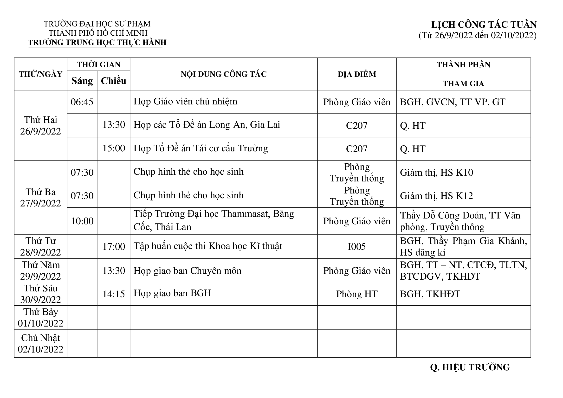 [LỊCH CÔNG TÁC TUẦN] TỪ NGÀY 26/9/2022 ĐẾN 02/10/2022 Trung Học Thực Hành 27 Tháng 9 2022 Lượt xem: 707