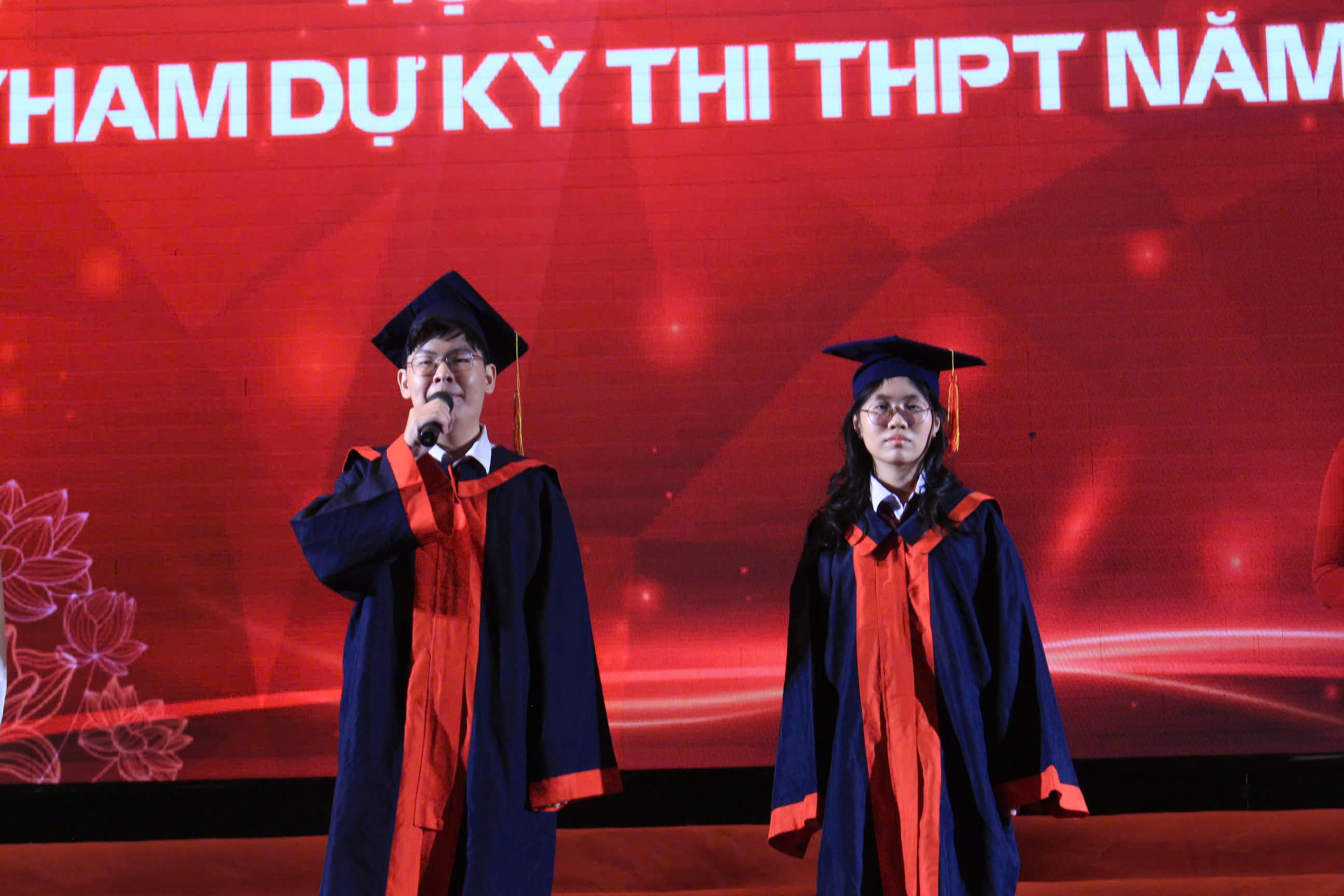Một điểm nhấn đầy cảm xúc của buổi lễ là nghi thức xuất quân dành cho các bạn học sinh khối 12, niên khóa 2022 – 2025 trước ngưỡng cửa bước vào kỳ thi tốt nghiệp THPT năm 2025. Lá Cờ Truyền thống của Trường Trung học Thực hành Đại học Sư phạm đã được trao tay đến các em học sinh K24. Lá cờ ấy không chỉ là biểu tượng truyền thống của “Nhà J”, mà còn là minh chứng cho niềm tin, kỳ vọng của thầy cô và cũng là sự tiếp nối giữa các thế hệ học sinh. Trong giây phút “vươn mình” ấy, lời tuyên hứa của các em học sinh khối 12 được cất vang, thể hiện sự quyết tâm, sẵn sàng đối diện với thử thách, nắm bắt cơ hội để viết tiếp ước mơ và hành trình của mình.