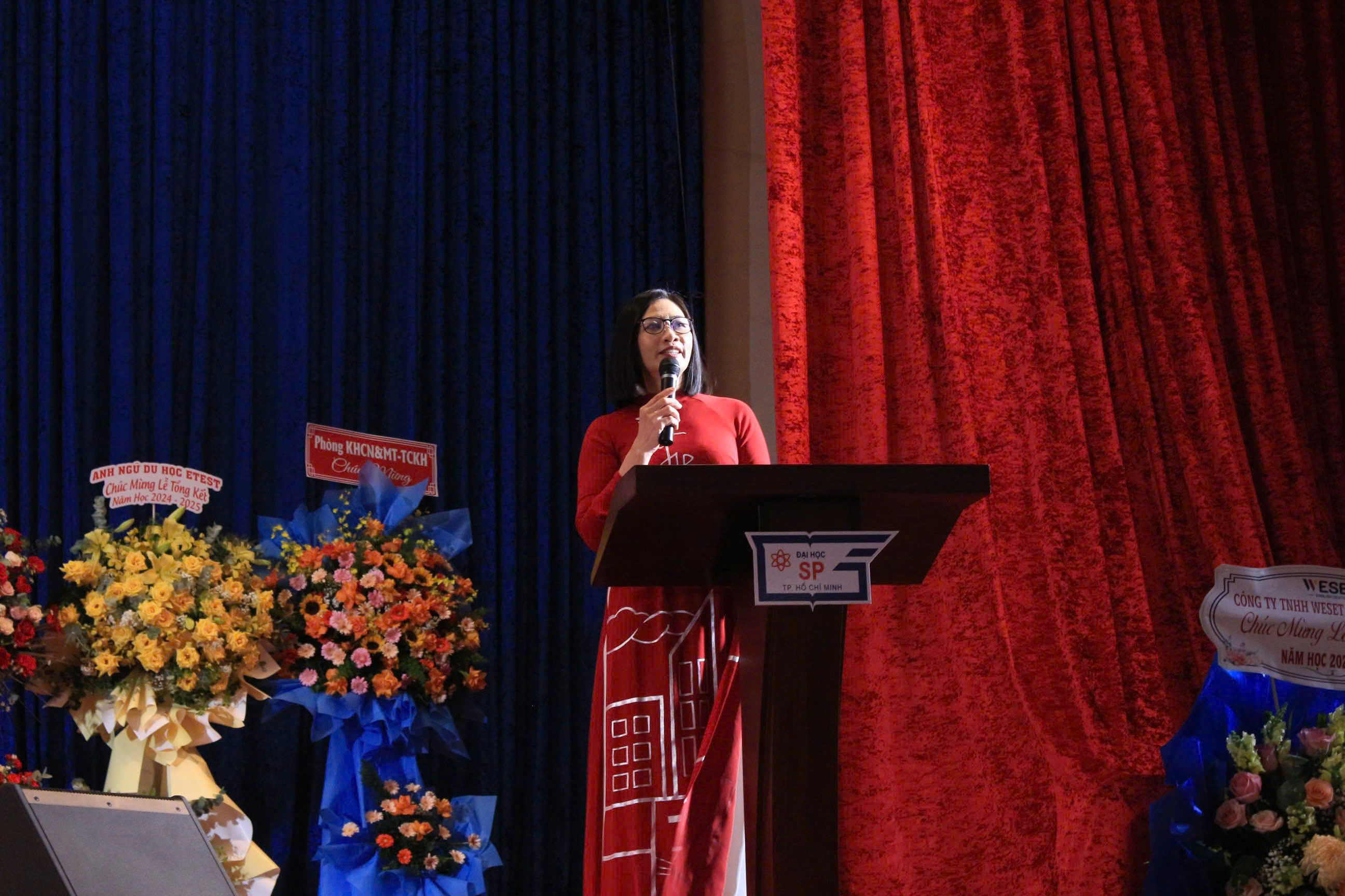 Cô Nguyễn Thị Tú – Chủ tịch Hội đồng trường, Hiệu trưởng Nhà trường phát biểu tổng kết hành trình năm học 2024 – 2025