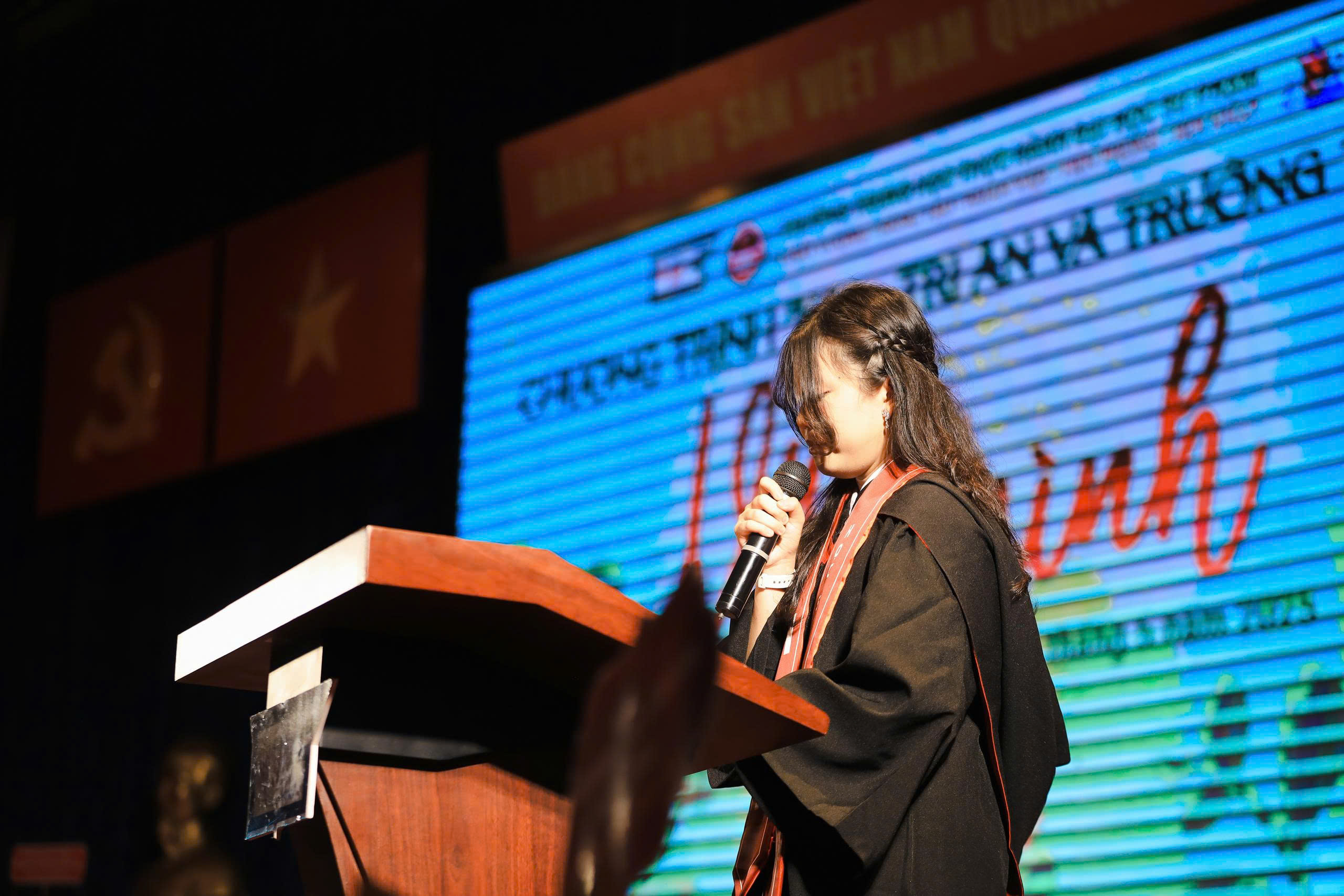 Em Nguyễn Đức Thảo Linh - Học sinh lớp 12.5, giải Nhì HSG cấp Thành phố môn Ngữ văn đại diện học sinh lớp 12 phát biểu tri ân