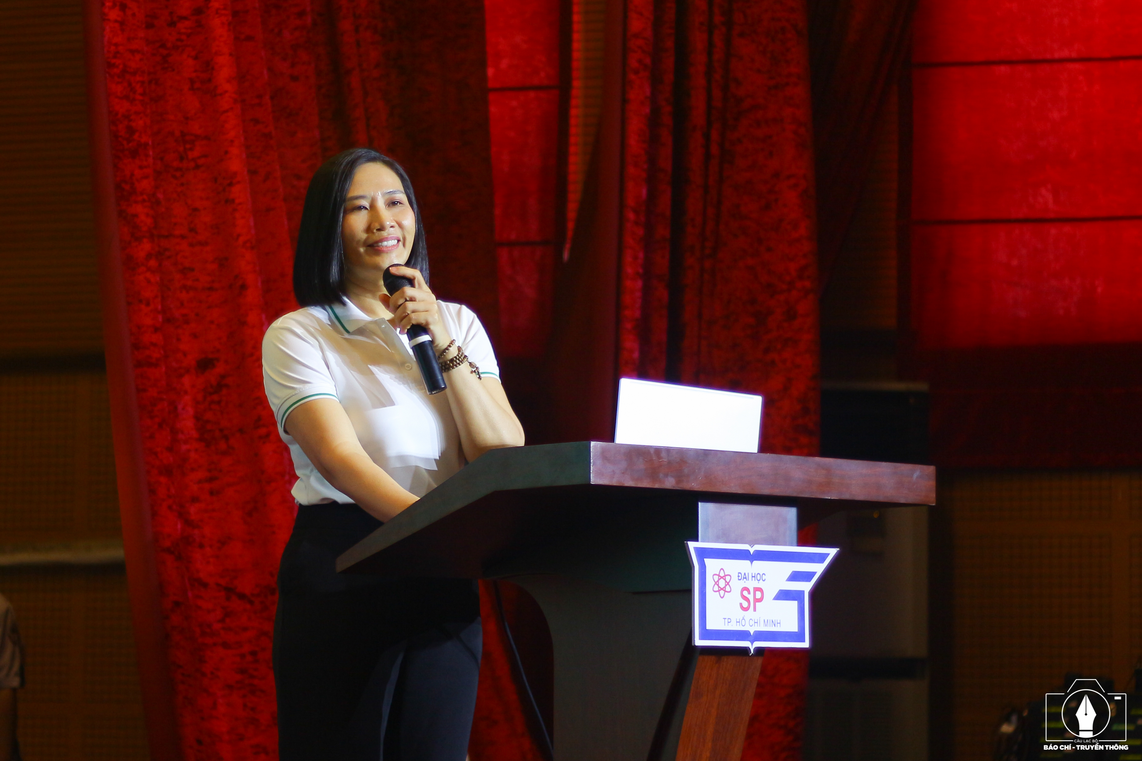 Cô Nguyễn Thị Tú - Hiệu trưởng Trường Trung học Thực hành Đại học Sư phạm, Trưởng ban điều hành nhiệm kỳ I phát biểu