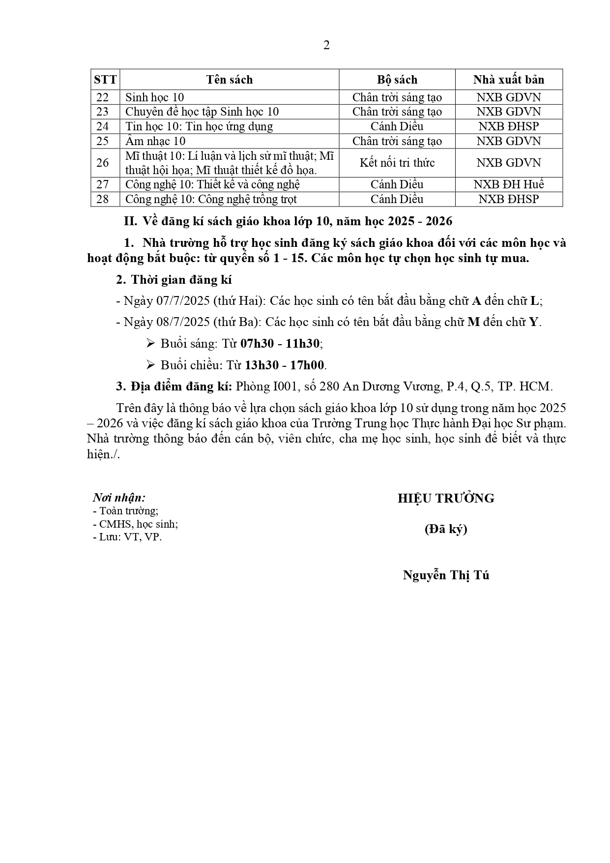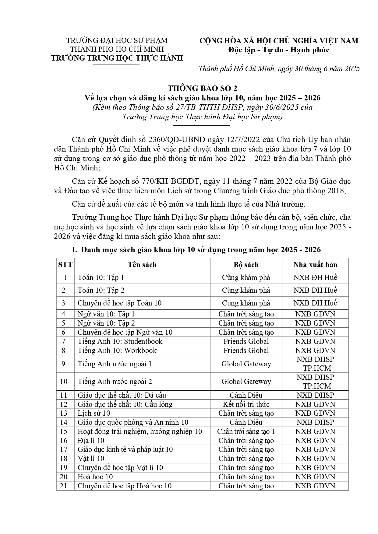THÔNG BÁO SỐ 02: VỀ LỰA CHỌN VÀ ĐĂNG KÍ MUA SÁCH GIÁO KHOA LỚP 10, NĂM HỌC 2025 - 2026 Trung Học Thực Hành 01 Tháng 7 2025 Lượt xem: 838
