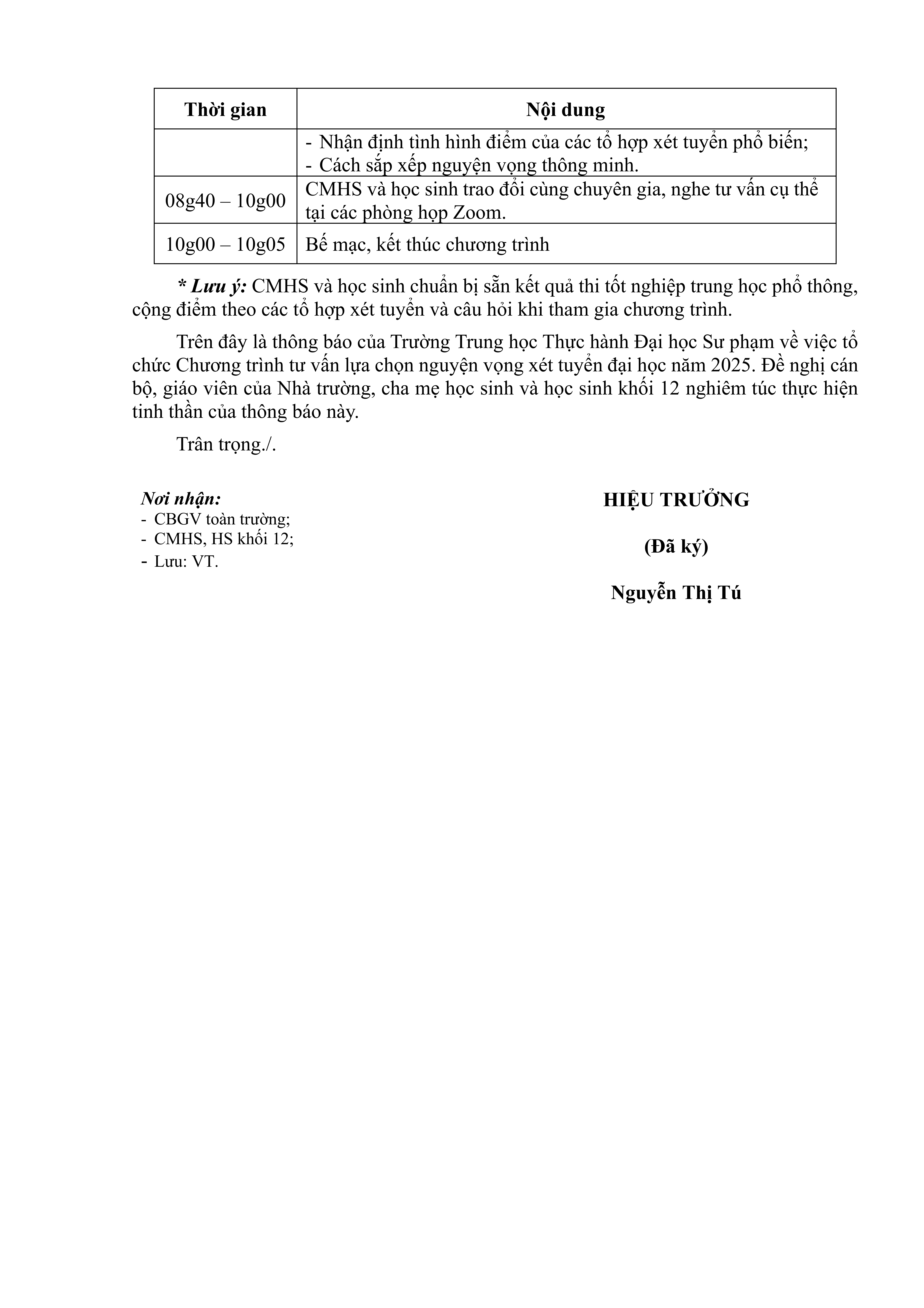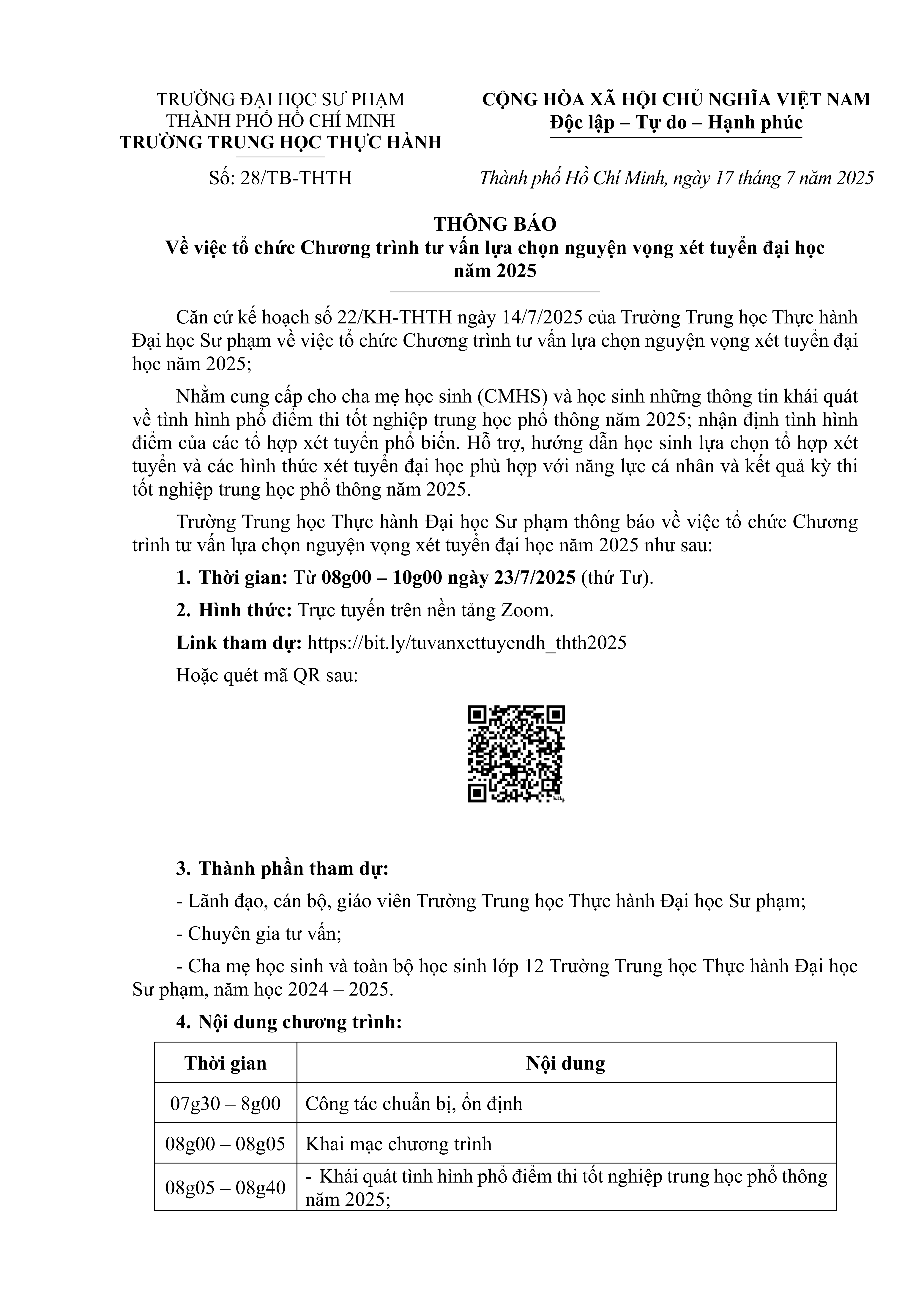 THÔNG BÁO VỀ VIỆC TỔ CHỨC CHƯƠNG TRÌNH TƯ VẤN LỰA CHỌN NGUYỆN VỌNG XÉT TUYỂN ĐẠI HỌC NĂM 2025 Trung Học Thực Hành 19 Tháng 7 2025 Lượt xem: 514