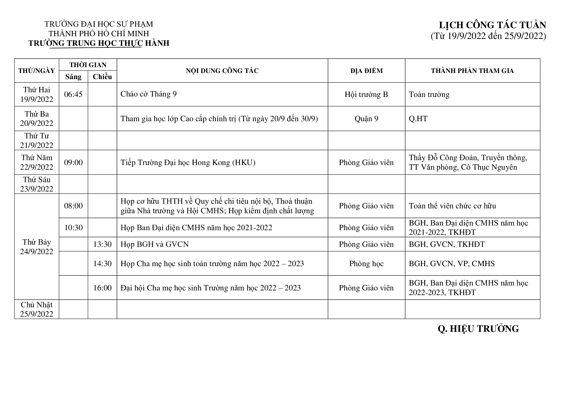 [LỊCH CÔNG TÁC TUẦN] TỪ NGÀY 19/9/2022 ĐẾN 25/9/2022 Trung Học Thực Hành 19 Tháng 9 2022 Lượt xem: 664